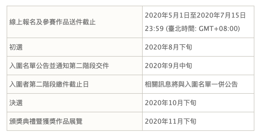 ※ 以上各獎項經(jīng)決選評審小組決議,得從缺或調整;同一作品于同一年度曾在臺灣地區(qū)政府中央部會主辦之相關競賽或臺灣地區(qū)教育部“鼓勵學生參加藝術與設計類國際競賽”之表列競賽項目中獲獎者,由決選評審小組擇優(yōu)核定獎勵金額,不受前項獎金額度限制。獎杯與獎狀以臺灣地區(qū)教育部部長名義頒發(fā),并于今年年底舉行頒獎典禮。所有得獎者將公布于官方網(wǎng)站及臺灣地區(qū)內外媒體,以提供廠商進行設計合作案之相關洽詢。