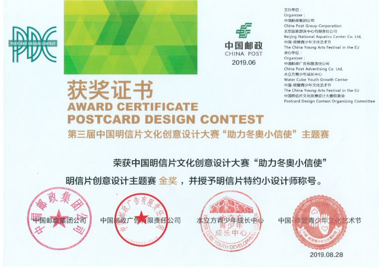 2019年第三屆中國明信片文化創(chuàng)意設計大賽證書樣例