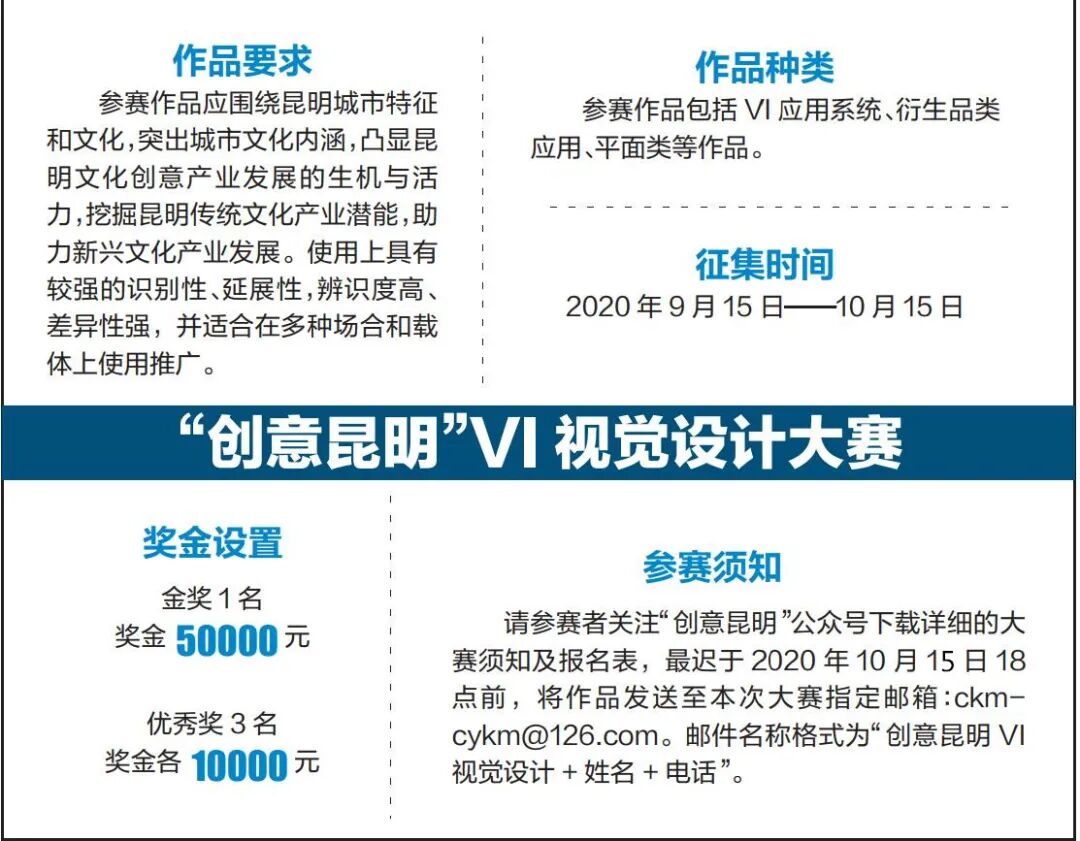 請參賽者關(guān)注“創(chuàng)意昆明”公眾號下載詳細的大賽須知及報名表,最遲于2020年10月15日前,將作品發(fā)送至本次大賽指定郵箱:ckmcykm@126.com。郵件名稱格式為“創(chuàng)意昆明VI視覺設(shè)計+姓名+電話”。
