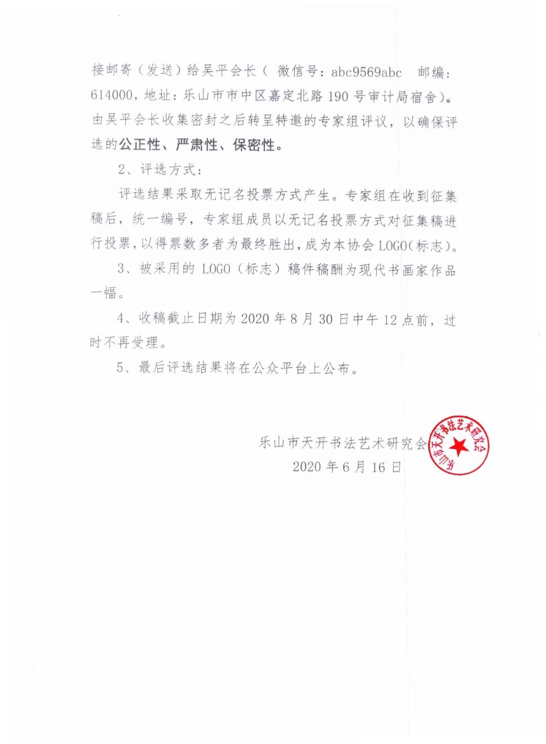 1、LOGO標(biāo)志設(shè)計(jì)應(yīng)在社會(huì)各屆人群中廣泛征集,請(qǐng)有志者各抒己見,以紙質(zhì)圖樣稿件的形式或微信圖片的方式直接郵寄(發(fā)送)給吳平會(huì)長(zhǎng)( 微信號(hào):abc9569abc 郵編:614000,地址:樂(lè)山市市中區(qū)嘉定北路190號(hào)審計(jì)局宿舍)。由吳平會(huì)長(zhǎng)收集密封之后轉(zhuǎn)呈特邀的專家組評(píng)議,以確保評(píng)選的公正性、嚴(yán)肅性、保密性。