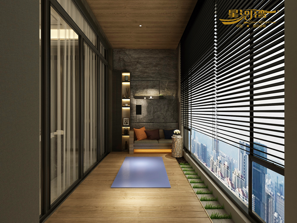 陽(yáng)臺(tái)臺(tái)階位的調(diào)整為中線對(duì)稱(chēng),左側(cè)凹位做枯山水配景,右側(cè)凹位補(bǔ)齊做展示,地面配色突出層次。窗簾為暗窗簾,整潔美觀。