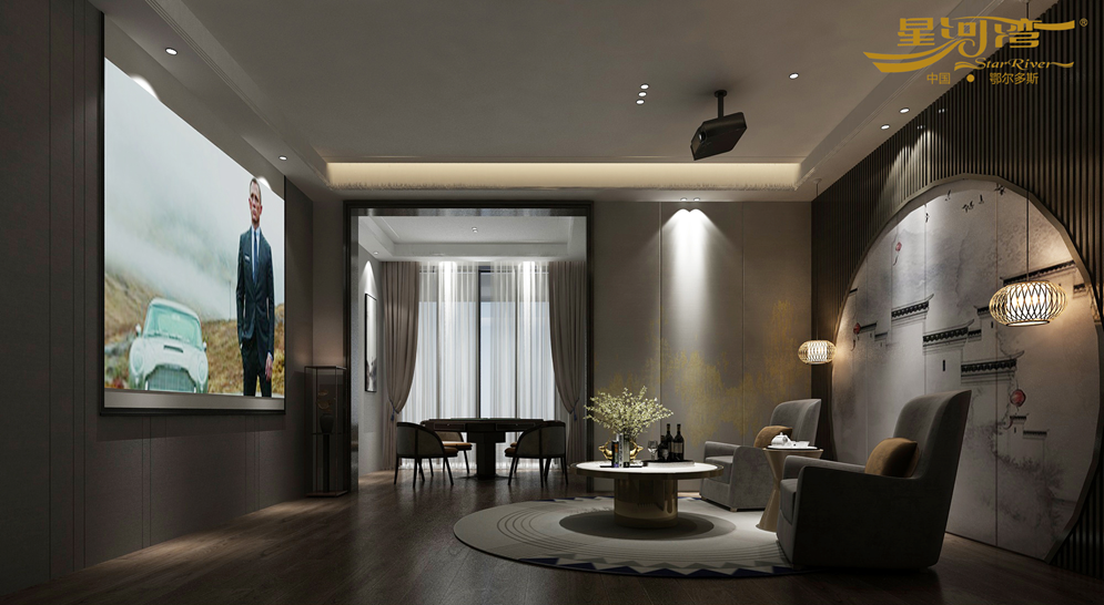 ①影音室豎線條搭配徽式馬頭墻墻卡造型,傳統(tǒng)中式與現(xiàn)代線條的融合。