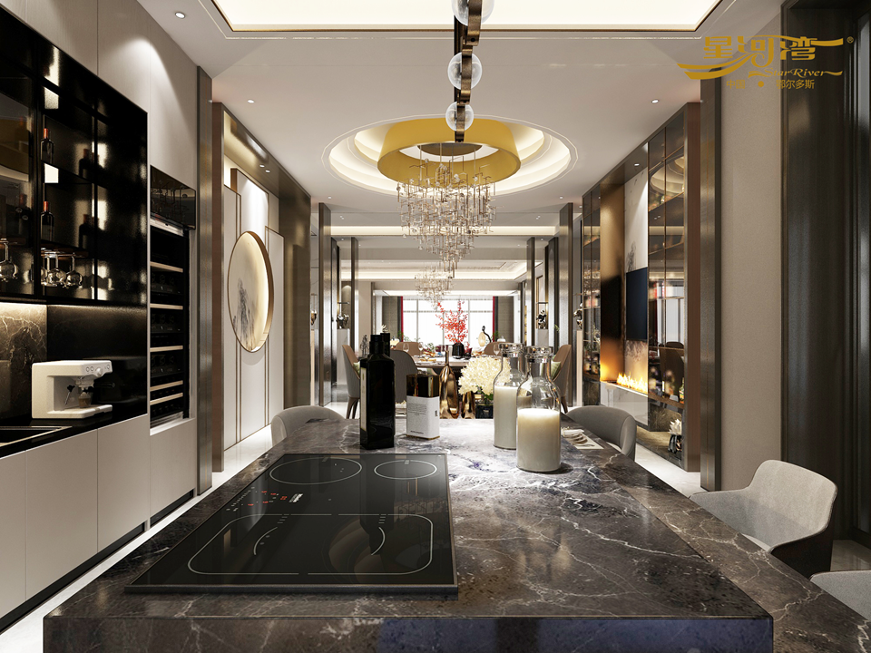 ②西廚增加簡(jiǎn)餐位置,方便使用。高低搭配島臺(tái),咖啡、紅酒任君品鑒。