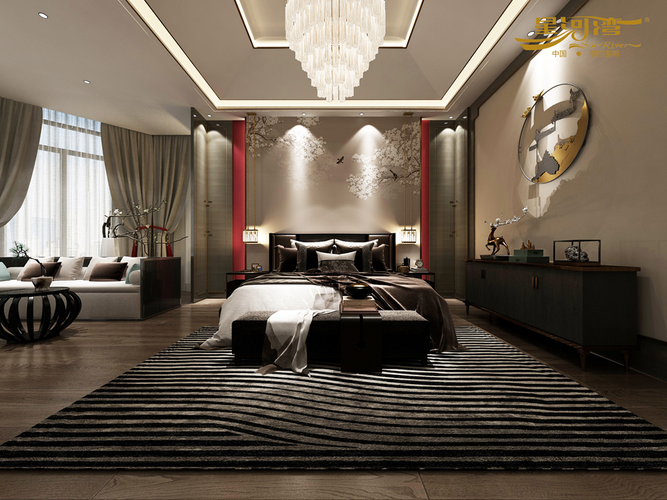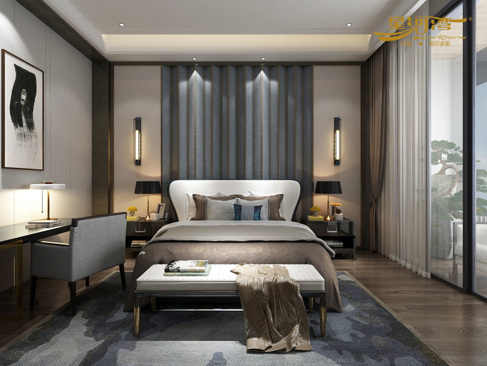 加長(zhǎng)床頭背景,調(diào)整床的擺放方向,半包圍背景及銅條鑲嵌方式,增加睡感的舒適性。吊頂做了梯形造型提升整體層高,增加空間高度,保持原有層高。